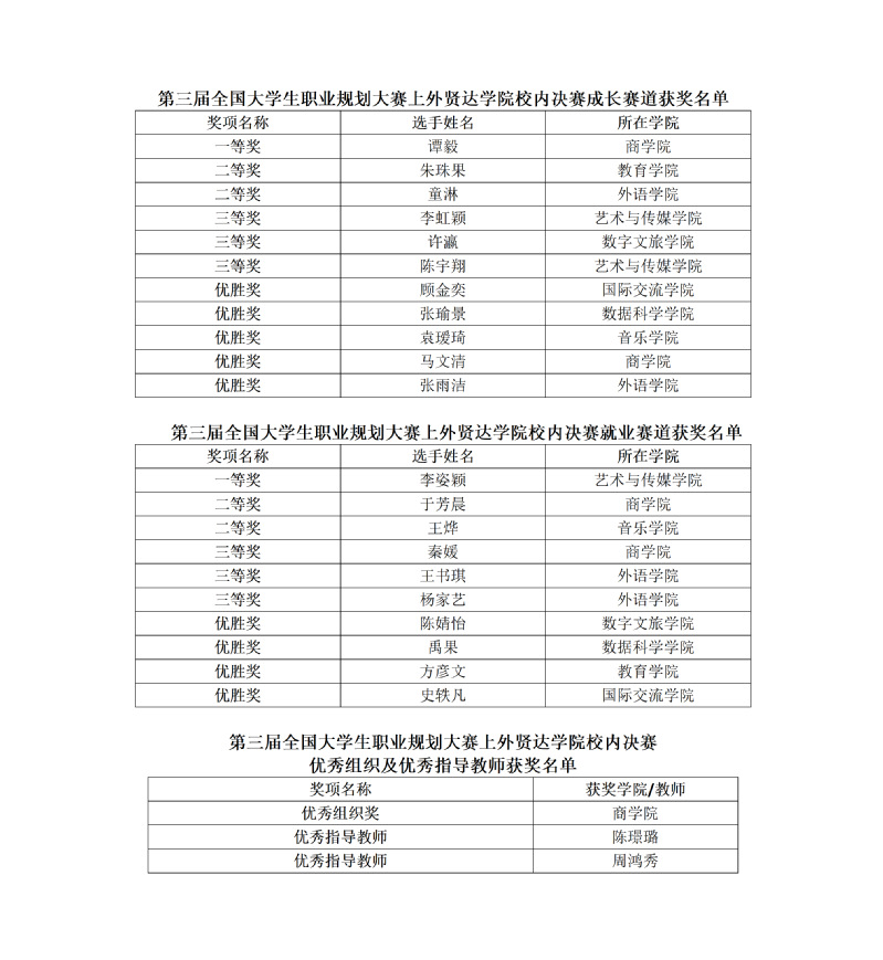 附:第三届全国大学生职业规划大赛贤达学院校内赛决赛获奖名单