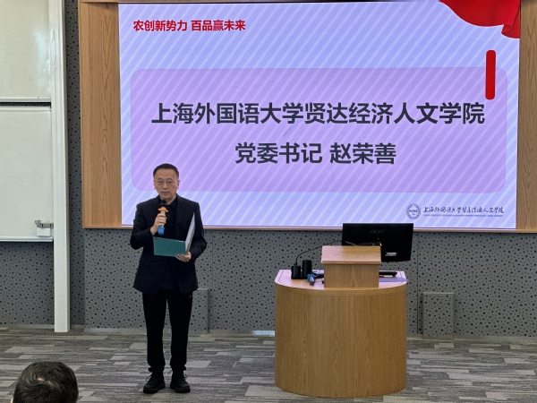 上海外国语大学贤达经济人文学院党委书记赵荣善首先为大会致辞。他代表学院对陈家镇政府及上海百农公司的支持表示衷心感谢。赵书记指出,乡村振兴,关键在于人;农业创新,希望在于年轻人。此次大赛不仅是展示同学们创新才能的平台,也是学校深化产教融合、助力乡村振兴的重要途径。学校将全力支持商学院建立“教育链—产业链—人才链”协同育人体系,让更多的商科智慧在崇明扎根,让更多的创新项目落地生根。赵书记希望同学们通过这次大赛,运用自己所学的专业知识,关注农产品质量提升、品牌建设、市场拓展等关键现实问题,勇敢地探索“农业+商科”的创新道路;也期待大家在交流中碰撞出新的思想火花,在实践中提升自己的综合能力。