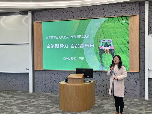大赛组委会负责人、商学院马妍老师全面介绍了此次大赛的举办背景、宗旨目标、参赛要求、赛程安排、评审标准及奖项设置等方面。本次大赛面向全校学生,鼓励跨专业组队,要求各参赛团队围绕百农公司指定的农产品,完成一份兼具创新性、可行性与商业价值的整合营销传播策划案,并在实践中比拼成果。马老师的介绍让同学们对赛程有了清晰的认知,摩拳擦掌,跃跃欲试。随后,八个学生团队代表先后发言,各代表队代表分享了自己团队对于参与此次大赛的期待与初步构想。学生纷纷表示,能够在一个真实的商业项目中检验所学、锻炼能力,是一次宝贵的机会。