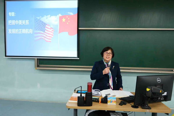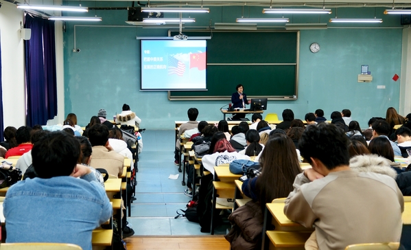 12月2日下午,上外贤达学院崇明校区语信楼318教室,校长温建平以“把握中美关系发展的正确航向”为主题,为学生们讲授“形势与政策”思政课程。