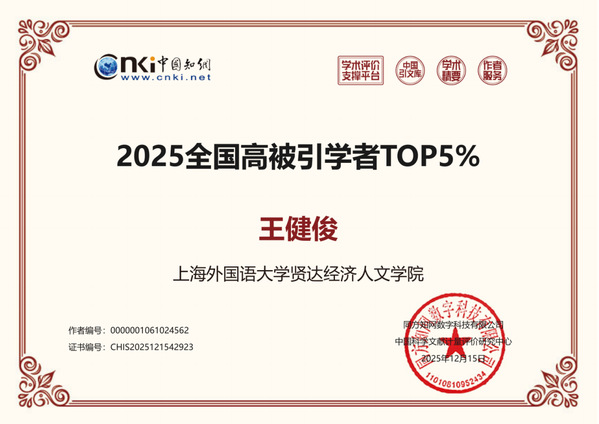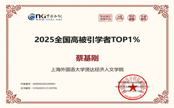日前,中国知网公布了“2025全国高被引学者”名单,我校外语学院蔡基刚教授入选“2025全国高被引学者top1%”名单,数据科学学院王健俊老师入选“2025全国高被引学者top5%”名单。
