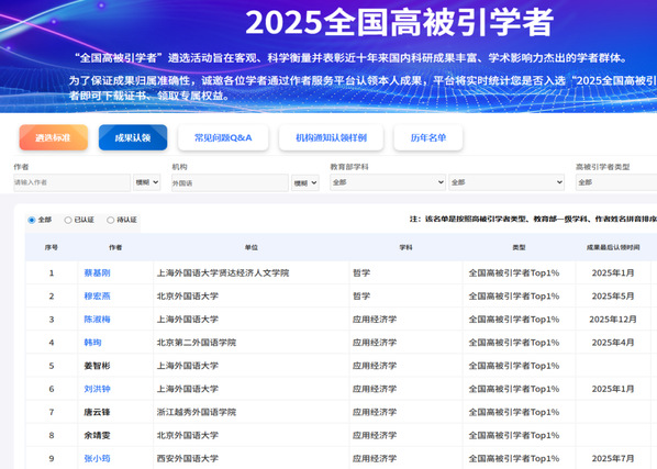 入选“2025全国高被引学者TOP1%”需满足:近十年发文的作者总PCSI 位于初选作者范围的TOP1%(共有学者3万人,基线值为31.815);且近十年发表PCSI高于理论平均值(1.65)的论文不少于5篇以及近十年至少发表1篇学术精要高影响力论文。其中,外国语言文学学科有325名学者入选。