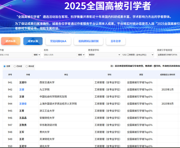 入选“2025全国高被引学者TOP5%”需满足:近十年发文的作者总PCSI位于初选作者范围的TOP5%;且近十年发表PCSI高于理论平均值(1.65)的论文不少于5篇以及近十年至少发表1篇高影响力论文。其中,工商管理类共有2514名学者入选。