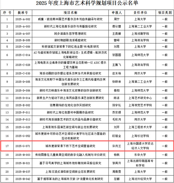 近日,根据上海市艺术科学规划领导小组办公室公示名单,我校许月兰老师申报的“城市更新背景下桥下艺术空间营造研究”课题成功获批立项资助。