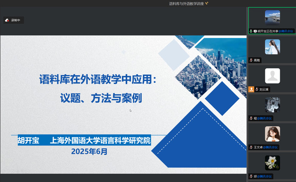 12月26日,教育部国家重大人才计划特聘教授、现任上海外国语大学校长助理、语料库研究院院长胡开宝教授应我校邀请,为我校教师带来了题为“语料库在外语教学中的应用:议题、方法与案例”的精彩讲座。本次讲座线上召开,由梁副校长主持。