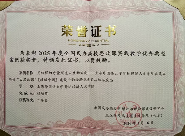 近日,全国民办高校思想政治理论课建设研究会公布了全国民办高校思政课实践教学优秀典型案例获奖名单。我校马克思主义学院程培英副教授撰写的《用榜样的力量照亮人生的方向——上海外国语大学贤达经济人文学院在民办高校“大思政课”〈对话中国〉建设中的经验探索的总结与反思》案例,凭借鲜明的育人特色与扎实的实践成效,荣获二等奖。