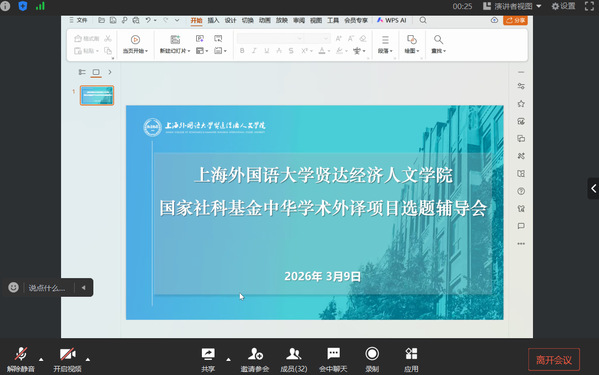 为推动学校中华学术外译项目申报工作,提升教师科研项目申报质量,3月9日,学校通过线上平台成功举办了一场针对性强、内容翔实的中华学术外译项目选题辅导会。温校长、梁副校长出席会议,意向申报教师及科研处工作人员参会。