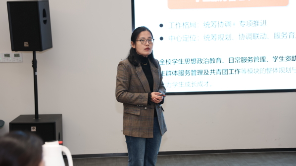会上,党委学工部部长张园园围绕新学期学生服务管理中心职能定位、工作模块调整及学期重点核心任务进行了详细介绍和解读。她指出,面对教育综合改革的新形势、新要求,学生工作必须主动应变、积极求变,通过系统设计与布局调整,构建全员、全过程、全方位、全领域的育人合力。她重点阐释了新学期学生管理工作统筹协调、联动支撑的工作机制,并就“一生一档”信息化平台建设、“一站式”学生社区建设、辅导员队伍建设等重点模块的下阶段工作要求进行部署,为新学期学生工作明确了路径与方向。