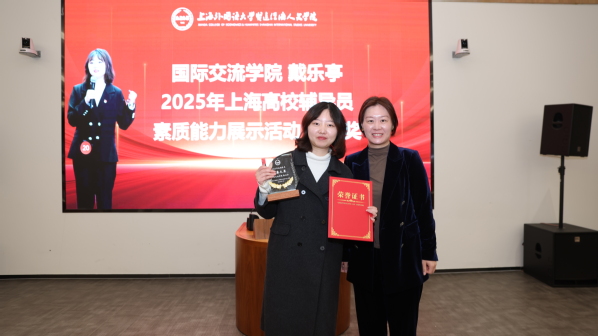 为充分发挥先进典型的示范引领作用,激励辅导员队伍见贤思齐、砥砺奋进,本次大会向在上海高校辅导员素质能力展示活动中斩获二等奖的戴乐亭老师进行表彰,陈应副校长为其颁发奖杯和荣誉证书,全场响起热烈掌声。