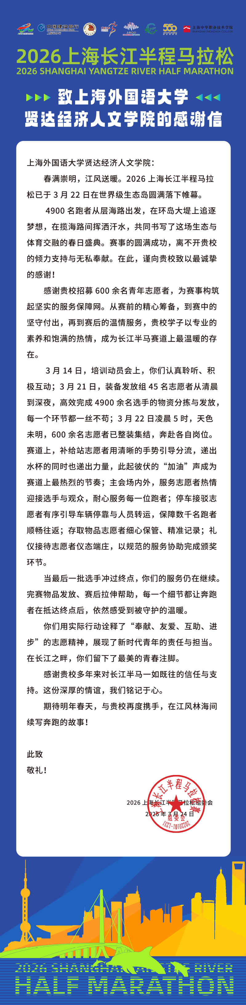 2026上海长江半程马拉松圆满落幕。我校作为志愿者派出主要单位,近日收到赛事组委会发来的感谢信。信中对我校600余名志愿者的出色表现给予高度肯定,称赞他们以专业的素养和饱满的热情,为赛事构筑起坚实的服务保障网,用实际行动诠释了“奉献、友爱、互助、进步”的志愿精神。